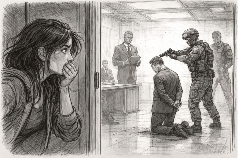 He was bound. He was on his knees. He wore a tailored jacket, dark fabric, pressed clean. His hands were folded in front of him as if he were waiting for a meeting to begin.